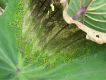 সাধারণ কাটুই পোকা আক্রান্ত কচুর পাতা